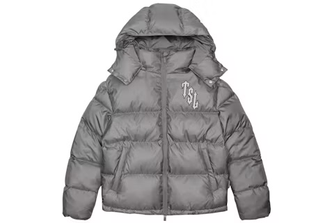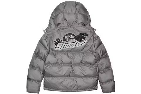• Bunda Trapstar Shooters Hooded Puffer v šedé barvě s kapucí pro výrazný streetwearový styl.
